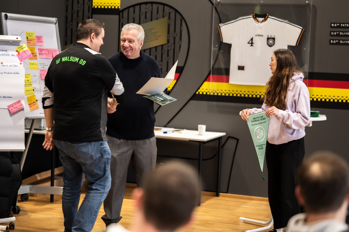 Am vergangenen Wochenende trafen sich 21 Vereine aus ganz Deutschland, um den Probelauf zur „Zertifizierung von Vereinen“ abzuschließen. Seit März 2025 wurde der DFB dabei von engagierten Amateurvereinen in der Entwicklung des neuen Programms unterstützt. Jeder Landesverband war vertreten und hat dazu beigetragen, einen ersten wichtigen Meilenstein auf diesem Weg zu erreichen. Um allen Beteiligten persönlich zu danken, war der zuständige DFB-Vizepräsident Peter Frymuth vor Ort.