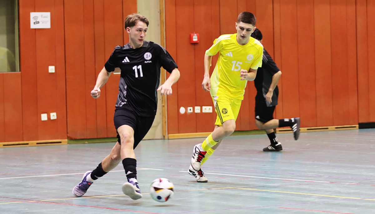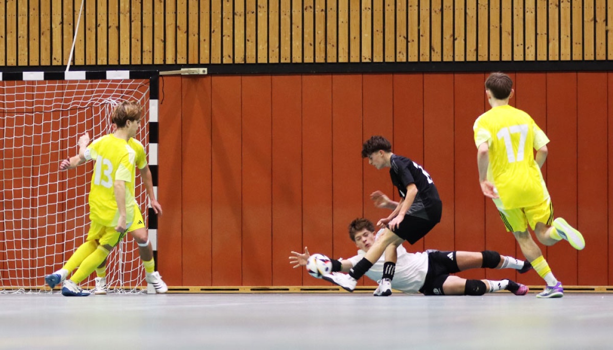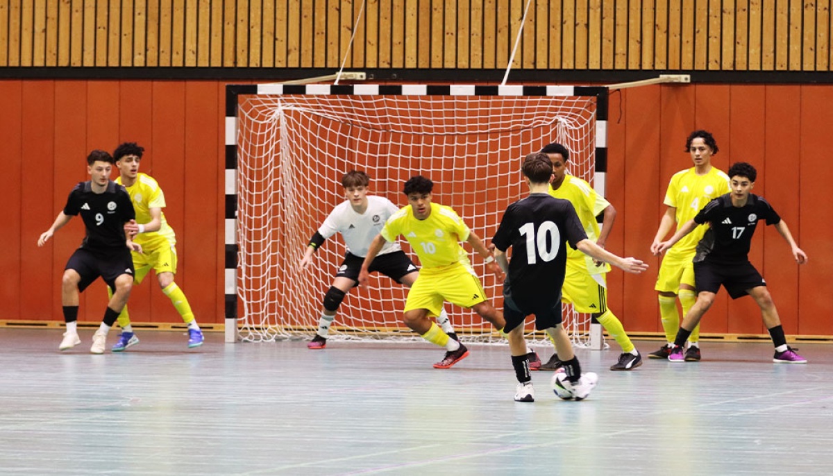 Die U 19-Futsal-Auswahl des Fußballverbandes Niederrhein (FVN) hat das DFB-Stützpunktturnier vom 2. bis 5. Januar in der Sportschule Wedau auf Rang 13 abgeschlossen. Einem 3:1-Auftaktsieg gegen Regensburg folgten Niederlagen gegen Frankfurt (2:4), Gütersloh (0:3) und Jena (0:3). Im letzten Spiel am Montagvormittag gegen Stuttgart musste sich das Team von FVN-Futsal-Trainer Benjamin Sahel und Co-Trainer Michael Wehling erst im Strafstoßschießen geschlagen geben - nach der regulären Spielzeit hatte es 3:3 gestanden.