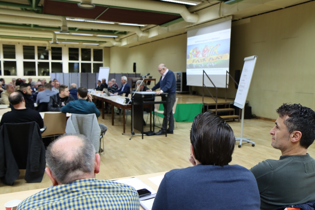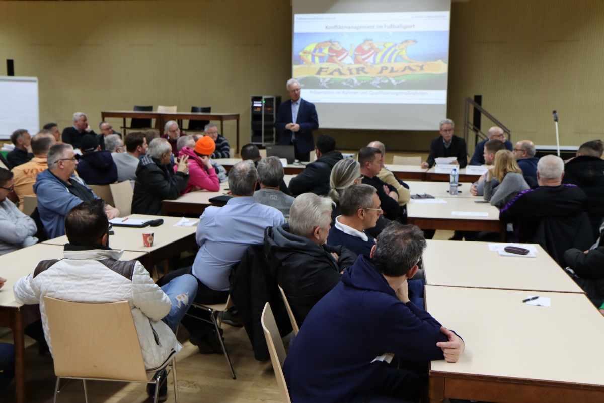 Beim "Gewaltpräventionstag" im Konferenzsaal zeigten Zupanc und Mölsen nach der Begrüßung ein rund fünfminütiges Video: Szenen auf und neben dem Fußballplatz, Gewaltvorfälle wie beeindruckende Fairplay-Gesten, untermalt mit lauter Musik. "Das war schon mal ein starker Einstieg. Alle im Saal waren gepackt davon und wussten sofort, worüber wir reden wollen und was Thema ist", sagt der Kreisvorsitzende Peter Thomas. Sein Mitstreiter Frank Mölsen "warf" die Worte "Respekt - Toleranz - Fairplay" an die Wand und richtete deutliche Wort an die Vereinsvertreter.