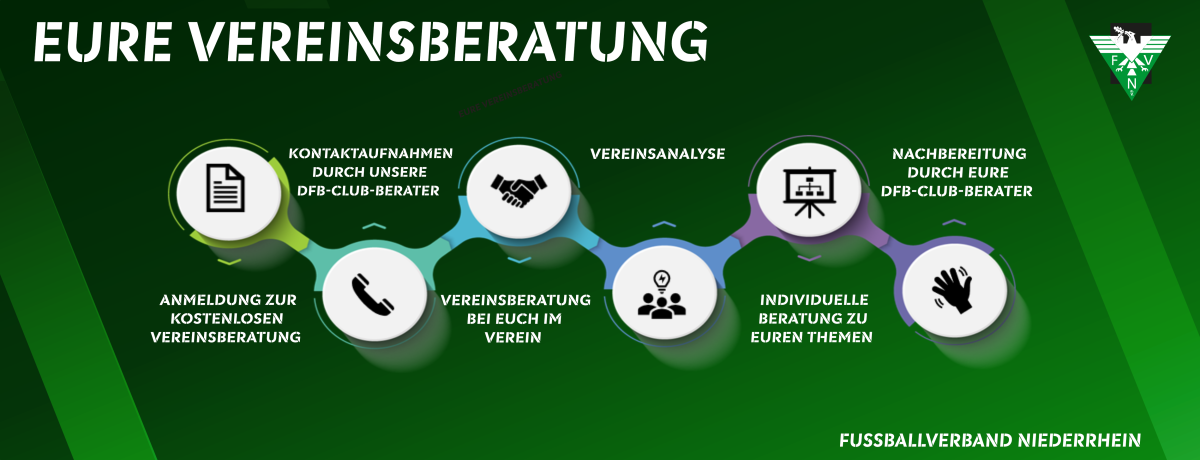 Die Vereinsberatung des FVN ist komplett kostenlos und findet direkt bei euch im Verein statt. Die Anmeldung erfolgt unkompliziert und unverbindlich über das Online‑Formular. Anschließend nehmen die DFB‑Club‑Berater/innen Kontakt zu euch auf, um einen Termin zu vereinbaren. In einem ersten Gespräch wird gemeinsam der Status quo erfasst und mögliche Handlungsfelder werden sichtbar gemacht. Auf dieser Grundlage erhaltet ihr individuelle Informationen, konkrete Hilfestellungen sowie passende Unterstützungsangebote des Verbandes – genau abgestimmt auf die Bedürfnisse eures Vereins.